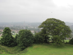 While only rocky ruins now cluster about the hilltop of Old Sarum, remnants of the castle's and cathedral's past glory, the view of the valley below is spectacular. From atop the old castle walls, one can see out over the city of Salisbury, easily picking out the spire of the new cathedral through the morning mist. Grand, old trees cluster around the hilltop, populated by ravens. You can see them wheeling through the sky in this picture taken looking out over Salisbury. Though often overlooked in favor of the more famous tourist attractions nearby, Old Sarum is worth a visit on a fair-weathered day, if only to take a picnic and enjoy the beautiful panorama of the Wiltshire countryside. |