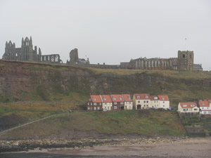 Because of the weather, we were forced to abandon much of our intended plans for the day, through we did make it to the village of Whitby, located on the eastern shore of England. “Visually dramatic, the buzzing fishing port and resort of Whitby, clings to the hills on the banks of the River Esk, its hilltop abbey ruins dramatically silhouetted against the sky. Other architectural highlights includes fine Georgian houses and humbler white fishermen’s cottages, linked by ginnels (alleys).” Whitby Abbey, sitting high on a cliff overlooking the village, was founded by St Hilda in AD 655, but was sacked by Vikings in 870. Benedictine monks rebuilt the abbey in the 11th century, but the ruins standing their today are mostly from the 13th century. These buildings were destroyed by Henry VIII and damaged further by German battleships in 1914. On the path side of the abbey’s clifftop graveyard is the cross of Caedmon, an illiterate laborer who worked at the abbey in the 7th century. He had a vision that inspired him to compose cantos of Anglo-Saxon religious verse still sung today. Sharing the windswept hillside is St Mary’s Church and its graveyard, reached by 199 steps. The two edifices provided a dramatic setting in Bram Stoker’s Gothic vampire novel Dracula (1897).