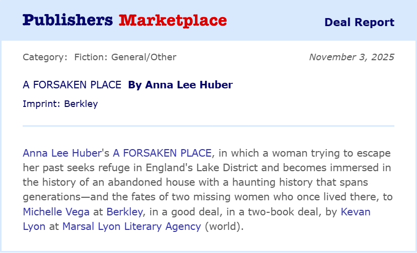 Sold! Author of the Lady Darby Mysteries Anna Lee Huber's AN ENDLESS ECHO, the first in a new historical mystery series, in which a widow of the Great War, and former Secret Service agent, investigates allegations that her late husband committed treason, and finds herself on the trail of a murderous plot, to Wendy McCurdy at Kensington, in a three-book deal, by Kevan Lyon at Marsal Lyon Literary Agency (World English). Foreign: Taryn Fagerness Agency